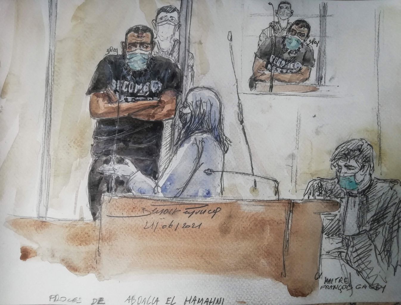 A court-sketch made in Paris on June 21, 2021, shows Abdalla El Hamahmi standing during his trial.