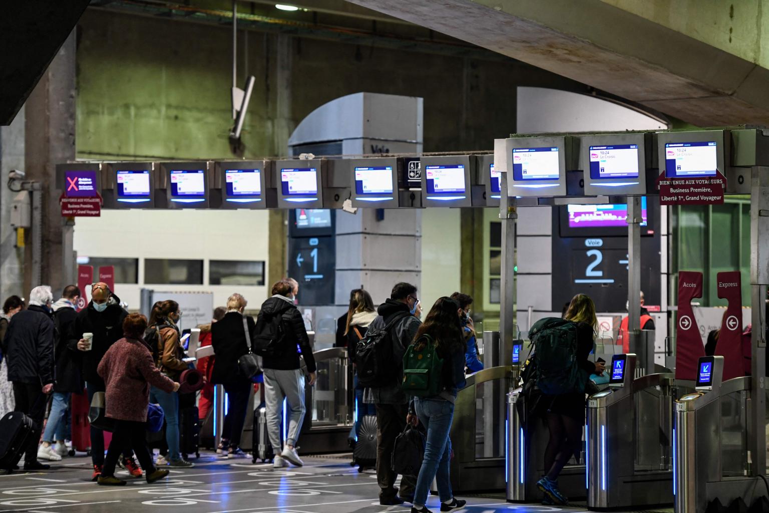 Passengers pass through security gates before boarding a train at the Montparnasse rail station on April 3, 2021.