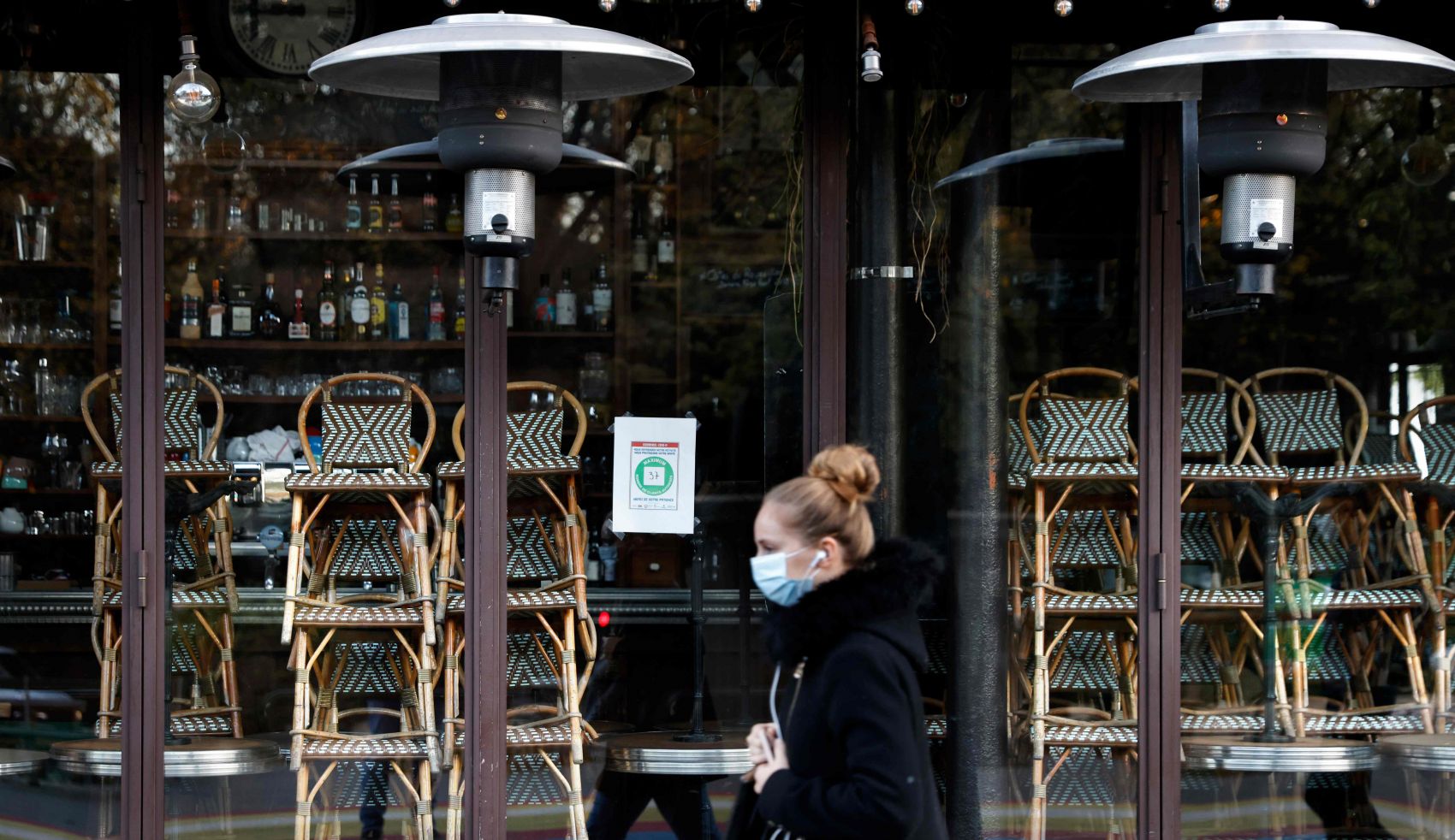 A woman walks past a closed restaurant in Paris during lockdown, on Nov 18, 2020.