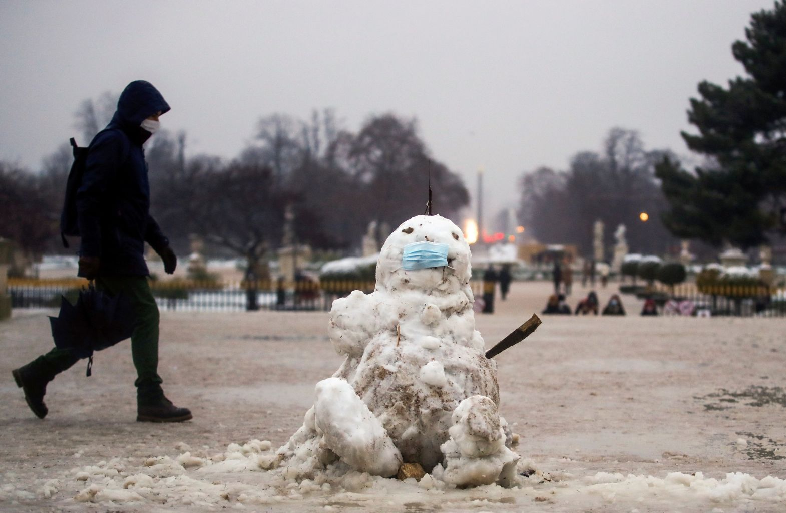 A man walks past a snowman in Paris shortly before a nationwide curfew starts, from 6pm to 6am, on Jan 16, 2021.