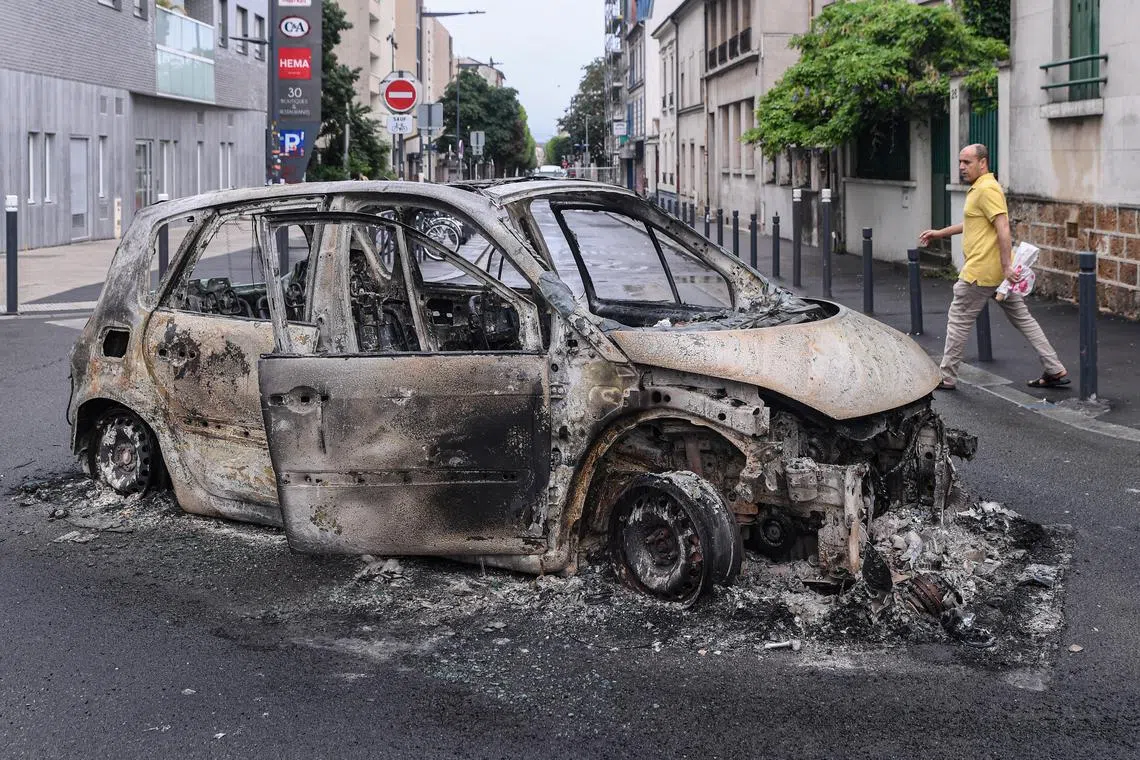 The remains of a burned-out car in Montreuil, near Paris, on July 1, 2023.