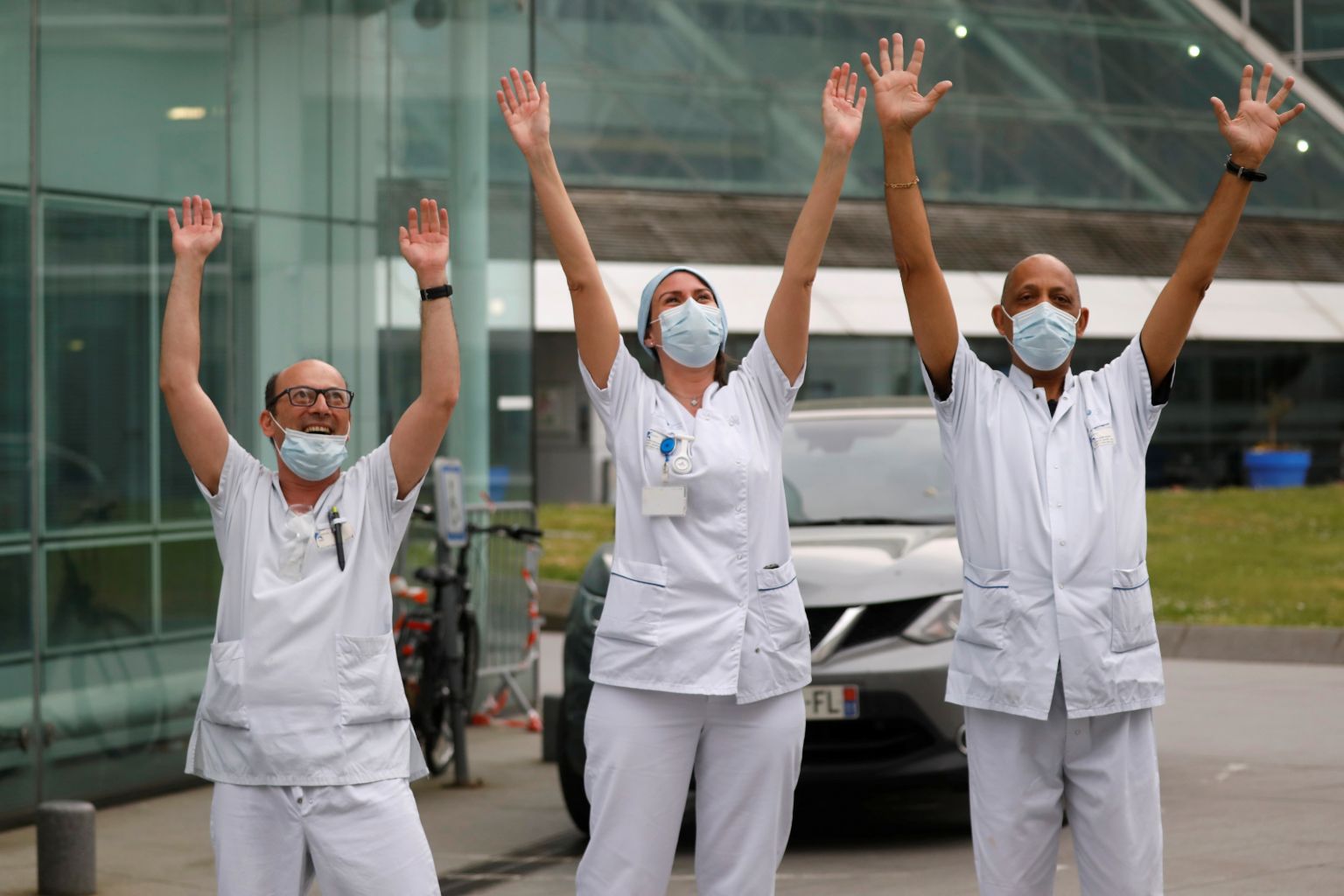Medical staff in Paris wave as residents applaud from their balconies to support healthcare workers, April 21, 2020.