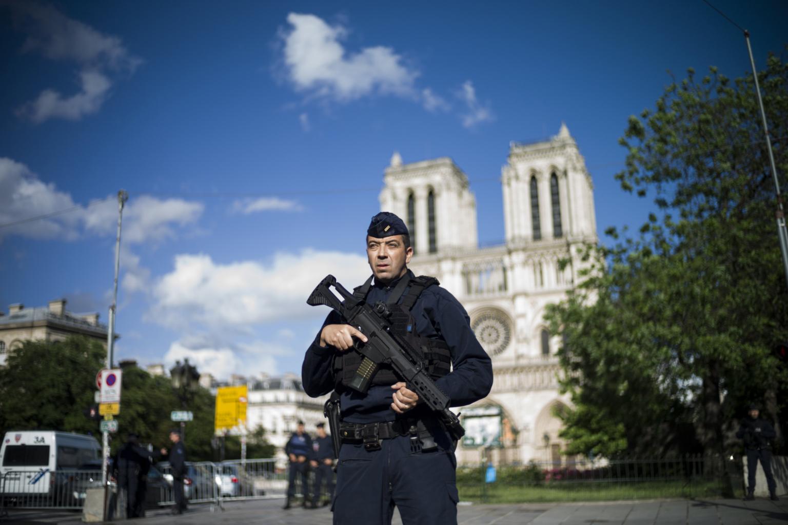 A French police officer stands guard outside of the Notre Dame cathedral after a man attacked a police officer with a hammer, in Paris, France, on June 6, 2017.