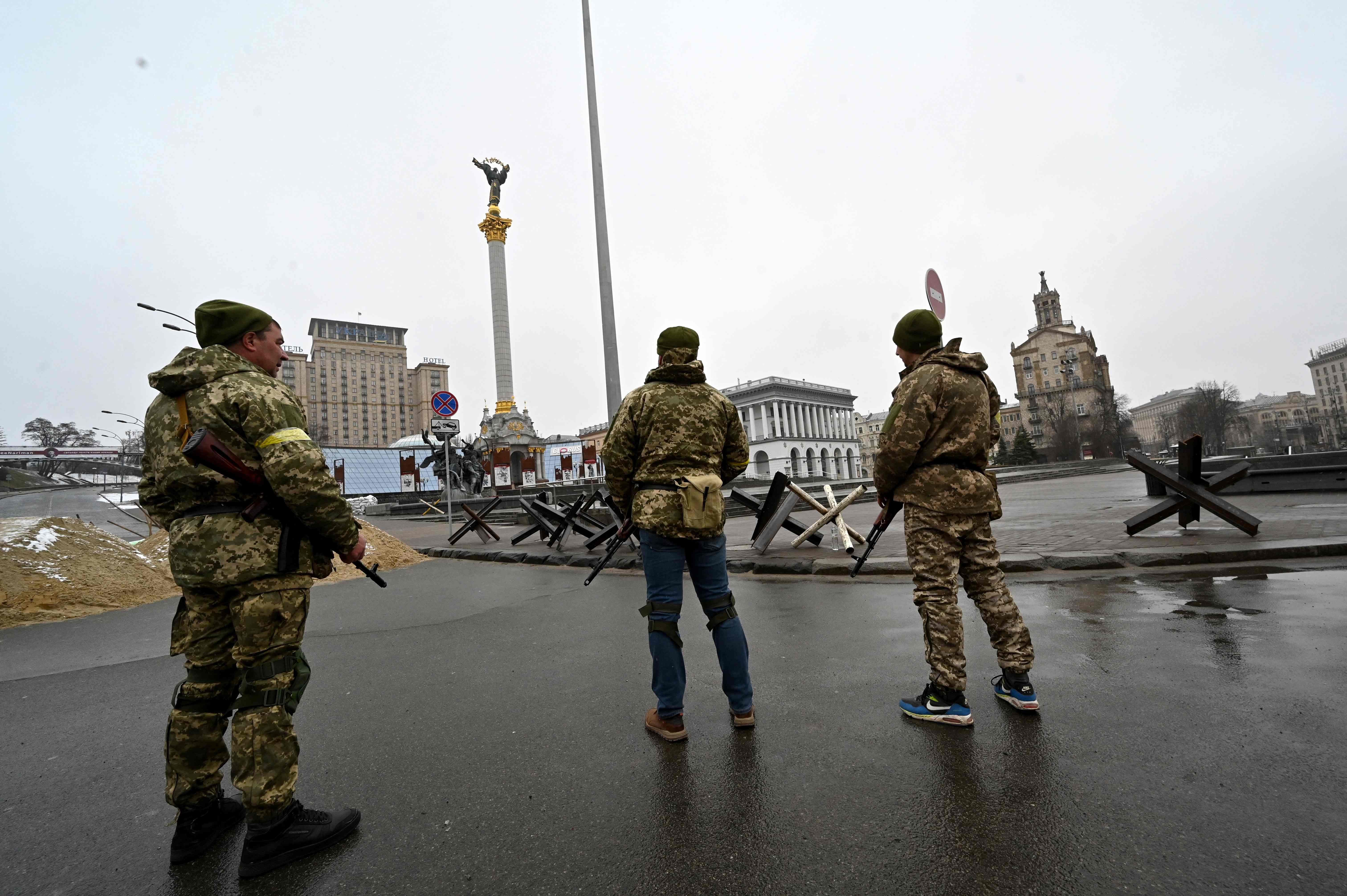 Fighters of the Ukrainian Territorial Defence Forces, the military reserve of the Ukrainian Armed Forces, stand guard at Independence Square in Kyiv, on March 2, 2022.