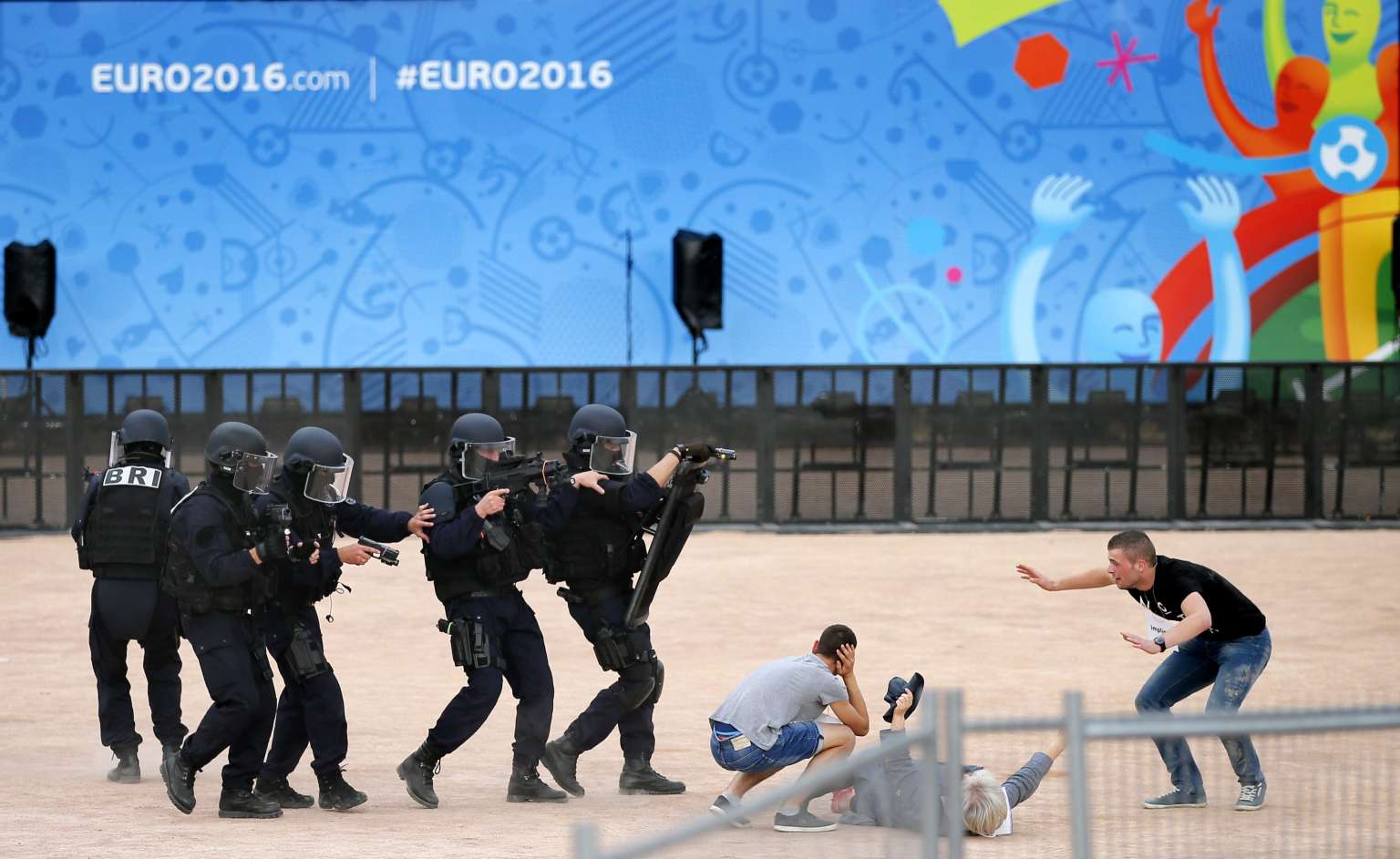 French anti-terror police officers and volunteers take part in an anti-terrorism exercise at the Euro 2016 fan zone in Place Bellecour, Lyon.