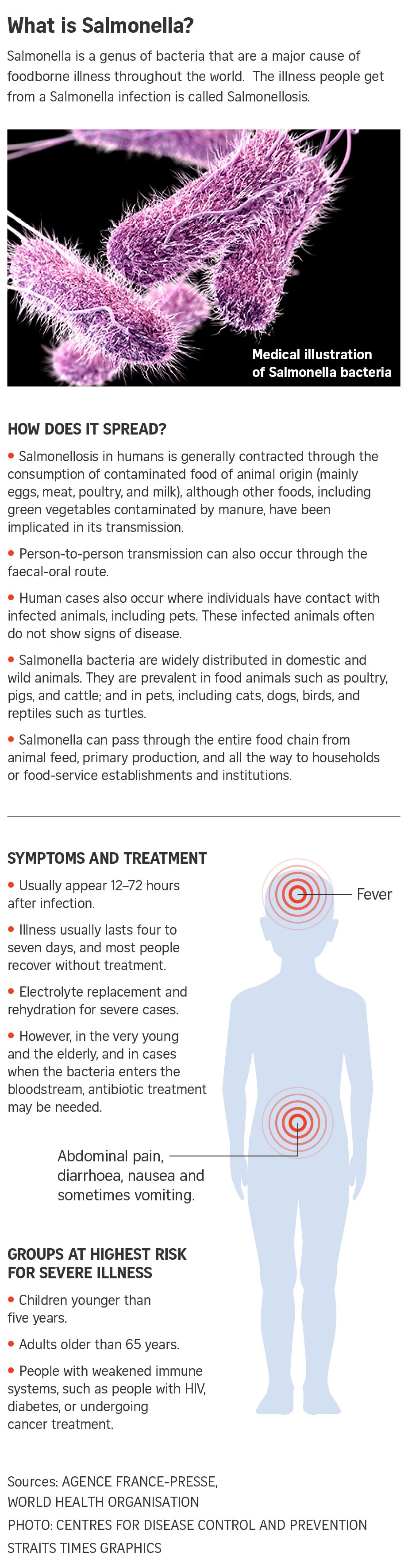 Salmonella symptoms include severe diarrhoea, stomach cramps and vomiting. The illness - caused by intestinal bacteria from farm animals - is especially dangerous for the very young and elderly because it can cause severe dehydration.