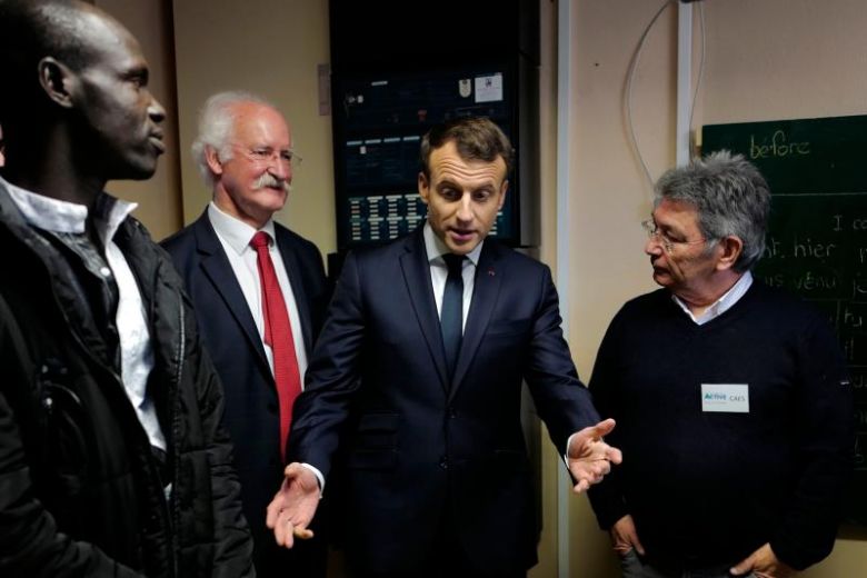 French President Emmanuel Macron (second from right) with migrants and a volunteer during his visit to a migrant centre in Croisilles, northern France, on Jan 16, 2018.