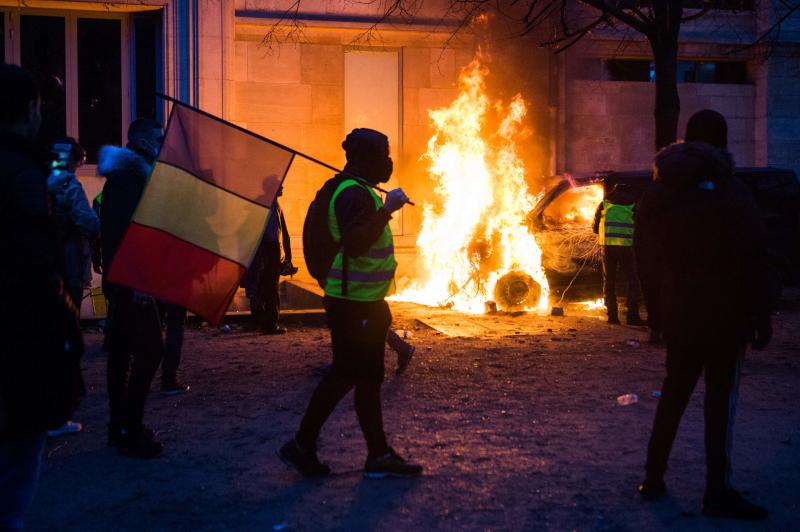 A demonstrator wearing a yellow vest, holds a French flag as a vehicle burns, on the Tuileries Garden, in front of the Musee de l'Orangerie, on Dec 1.