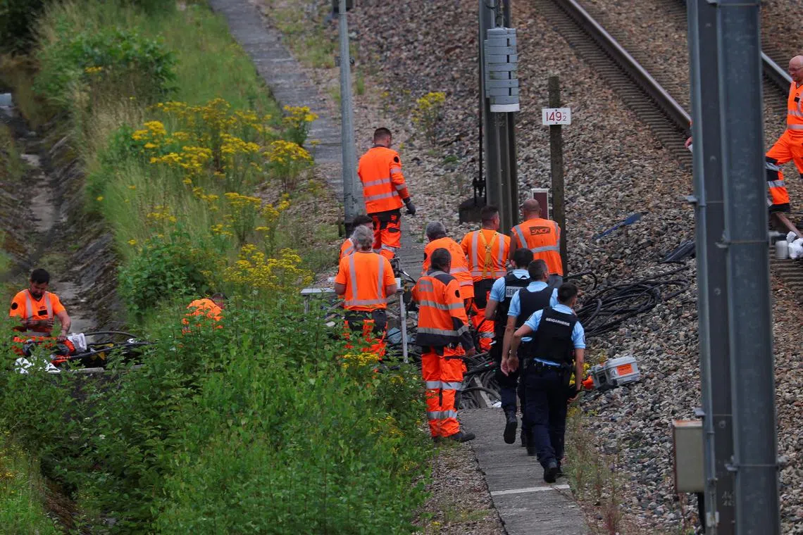 SNCF railway workers and police officers work at the site in Croisilles where vandals targeted France’s high-speed train network on July 26.