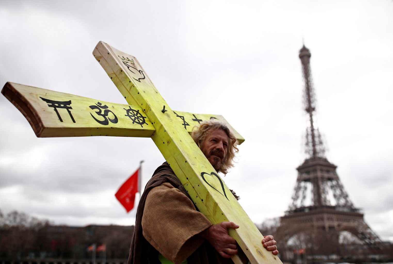 A yellow vest protester walks past the Eiffel tower during a demonstration in Paris, March 2, 2019.