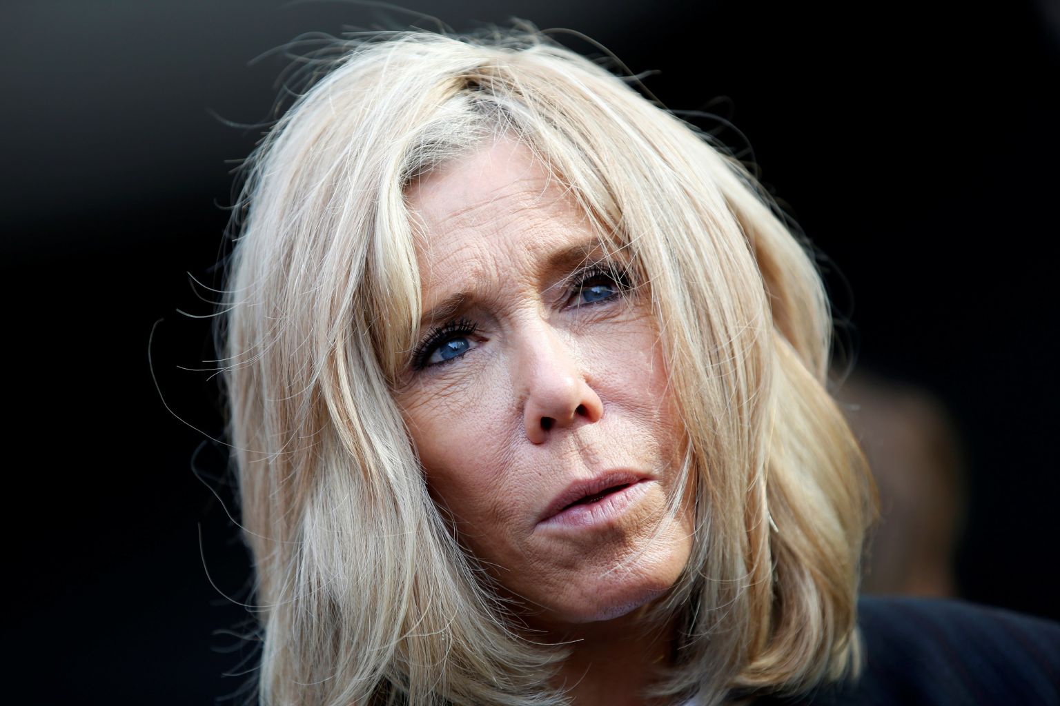 Brigitte Macron talking to journalists during a school visit in Paris, Oct 14, 2019.