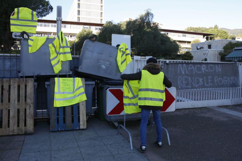 A yellow vest being hung in front of the blocked Laetitia Bonaparte high school in Corsica, France, on Dec 5, 2018.