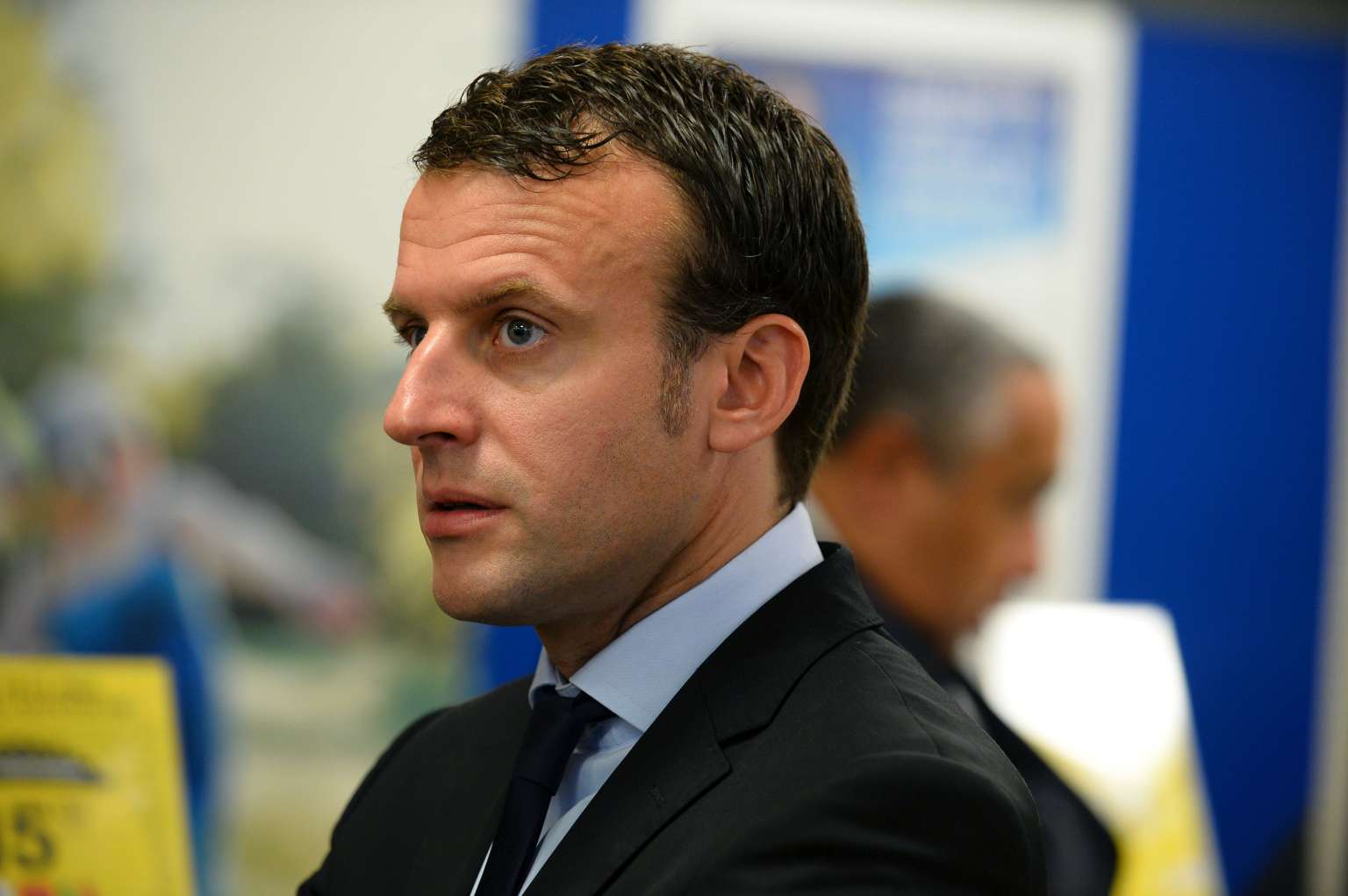 French economy minister Emmanuel Macron stands inside the Post Office to unveil a stamp in Montreuil after protesters threw eggs on his head, on June 6, 2016.