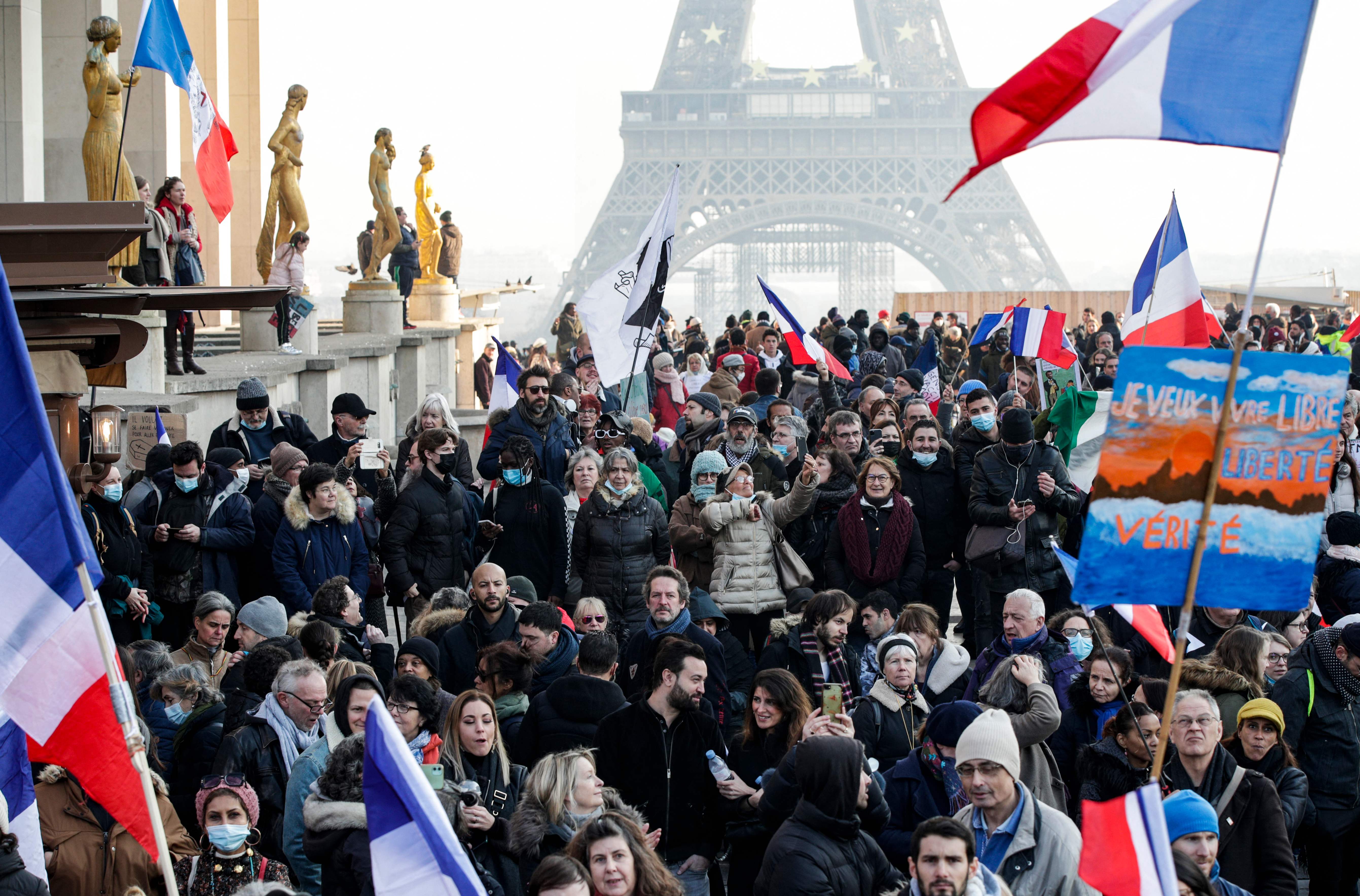 Protesters demonstrate against the vaccine health pass and Covid-19 vaccines in Paris on Jan 15, 2022.