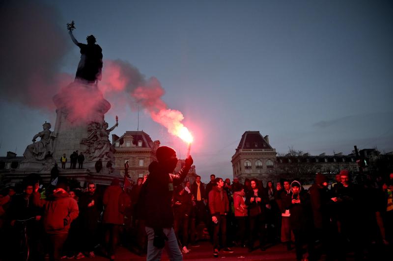 Protesters light flares during a demonstration in Paris, on Jan 11, 2020, as part as a nationwide multi-sector strike against the French government's pensions overhaul.