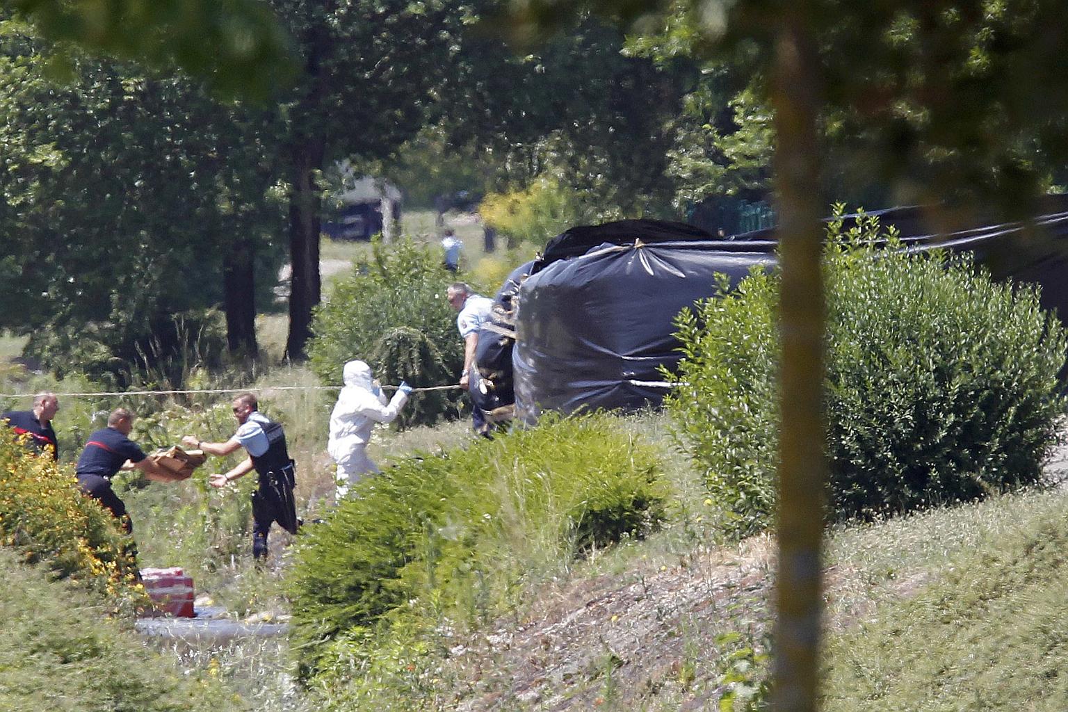 French crime scene investigators, Gendarmes and rescue forces are working next to a black plastic sheet outside a gas company site at the industrial area of near Lyon, France.