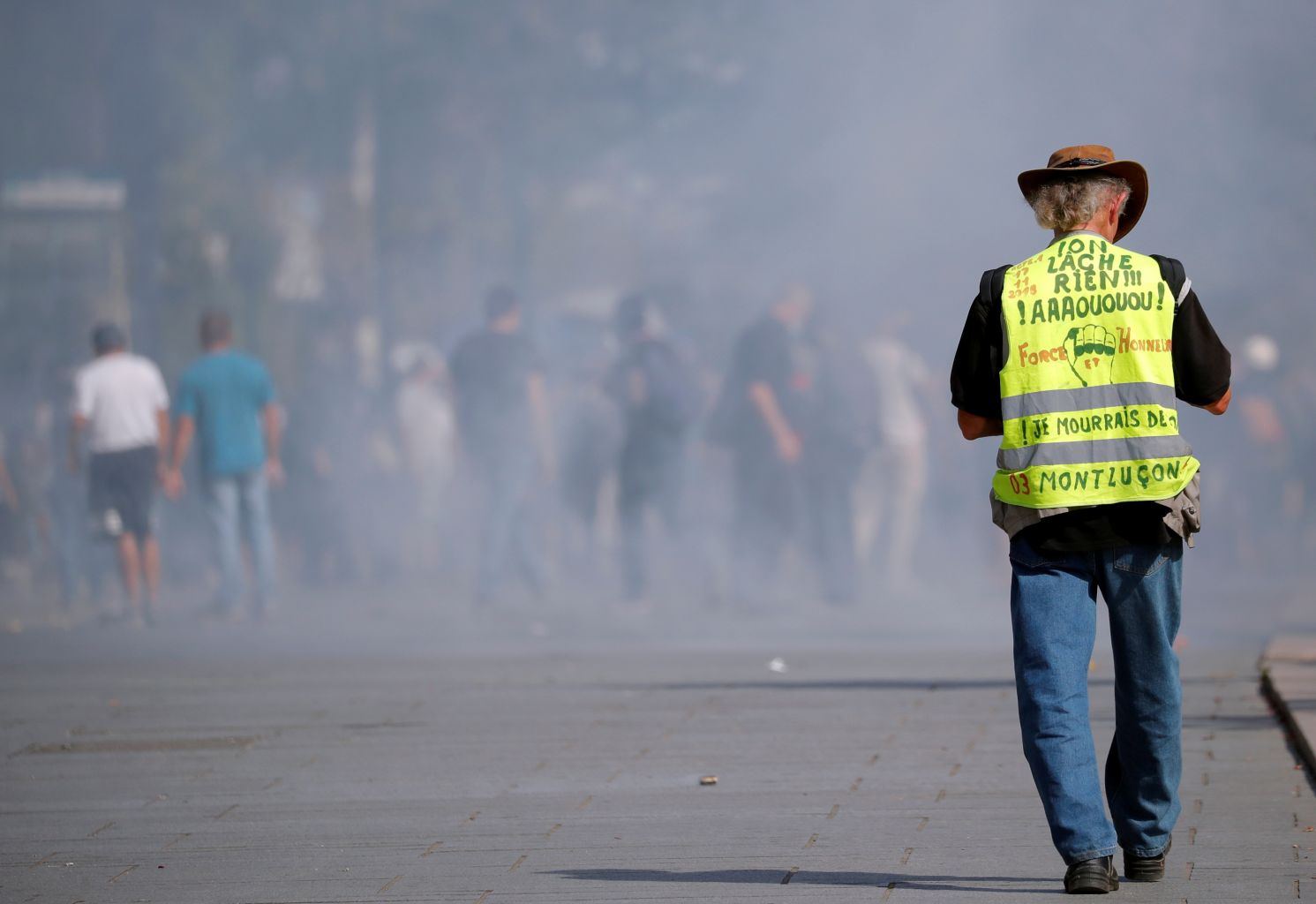 A protester wearing a yellow vest walks among tear gas as protesters clash with French riot police in Nantes, France, Sept 14, 2019.