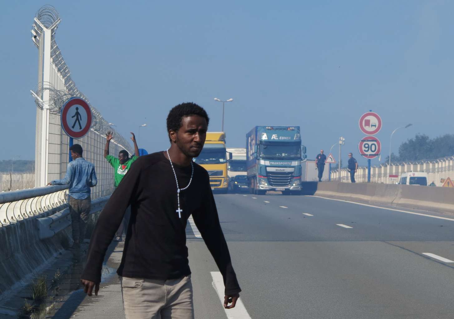 The clashes took place not far from where a British-financed wall is being built to seal off the road, where migrants frequently try to jump on trucks bound for Britain.