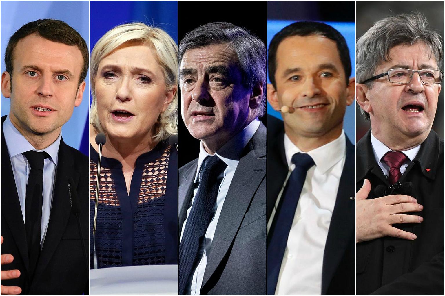 Top five contenders of the French presidential election (from left) Emmanuel Macron, Marine Le Pen, Francois Fillon, Benoit Hamon and Jean-Luc Melenchon will face off in a TV debate that could help sway legions of undecided voters, a month before they go to the polls.