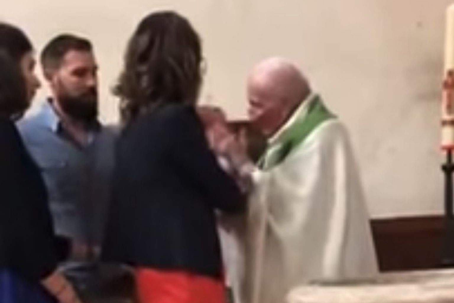 In footage posted on Twitter on Thursday, gasps can be heard when the 89-year-old priest, after ordering the infant he is holding to "be quiet", sharply slaps his cheek.