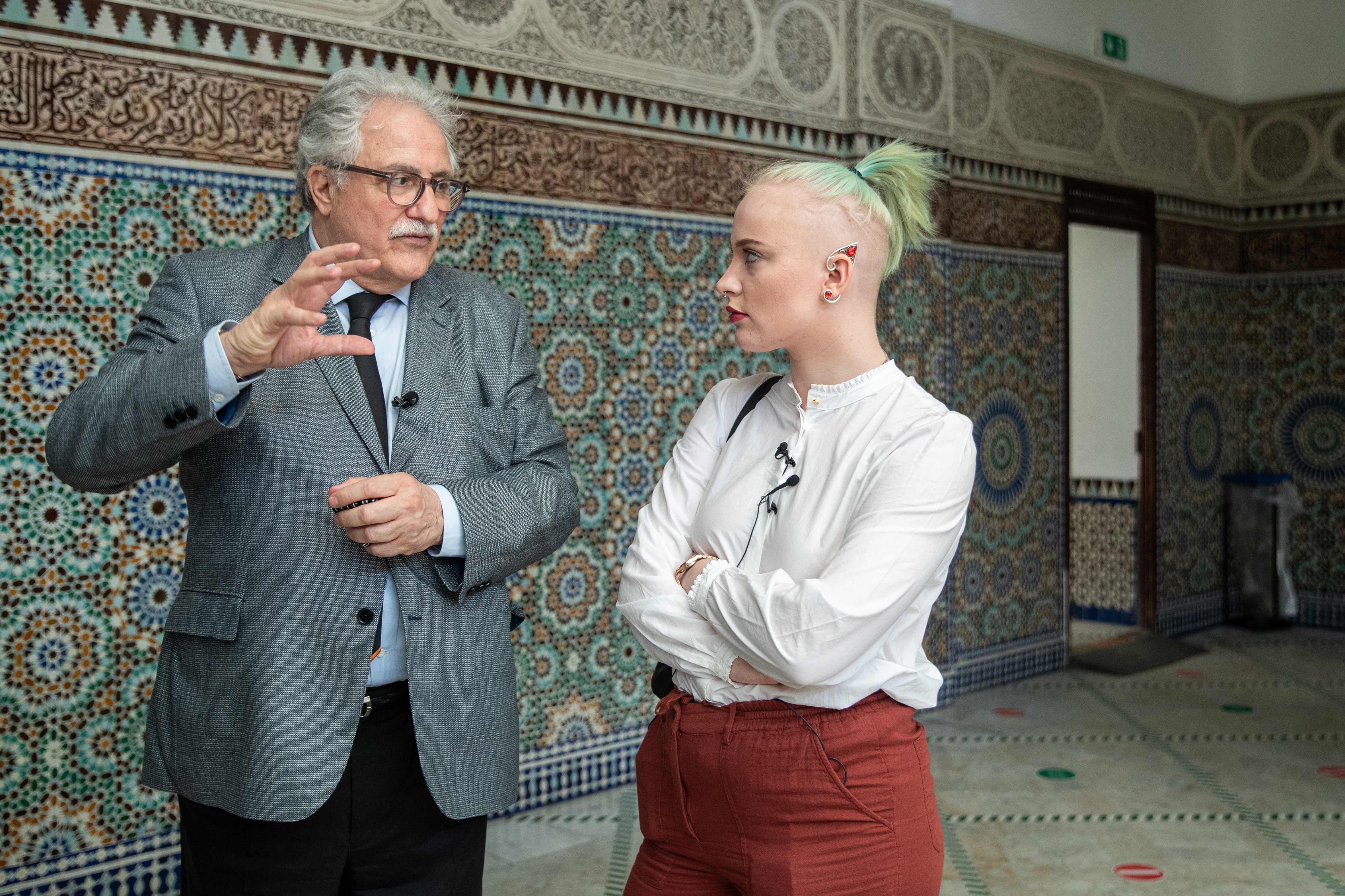 Mila (right) vists the Great Mosque of Paris with Imam Chems-Eddine Hafiz on July 8, 2021.