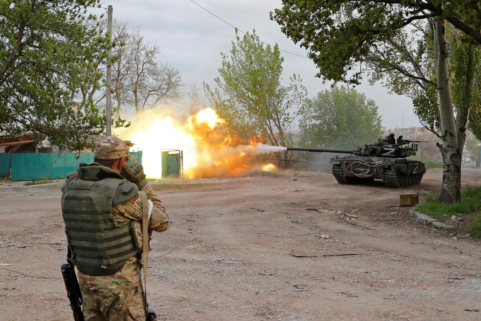 Members of pro-Russian troops fire from a tank during a fight near the Azovstal steel plant in Mariupol, on May 5, 2022.