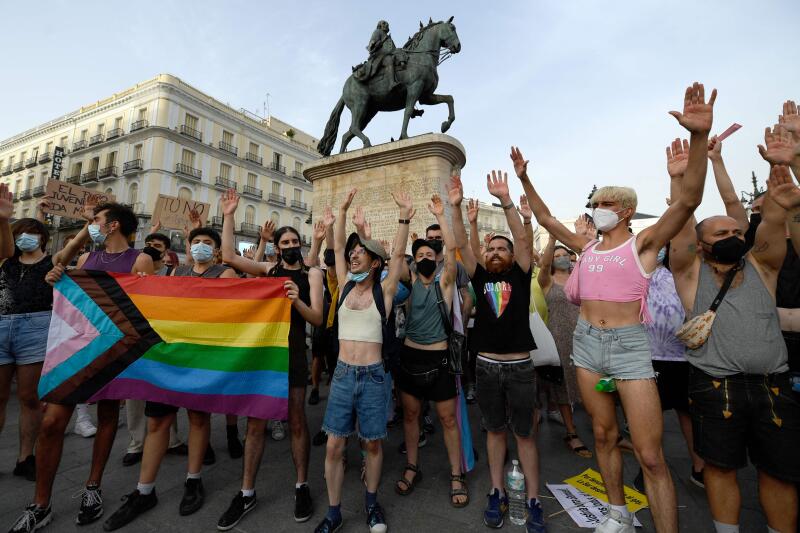 People protest against LGTBI-phobia at the Puerta del Sol square in Madrid, on July 11, 2021.