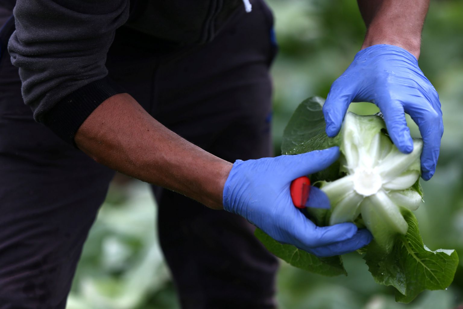 A migrant worker examines a lettuce at a farm in Kent, Britain, in July 2017.