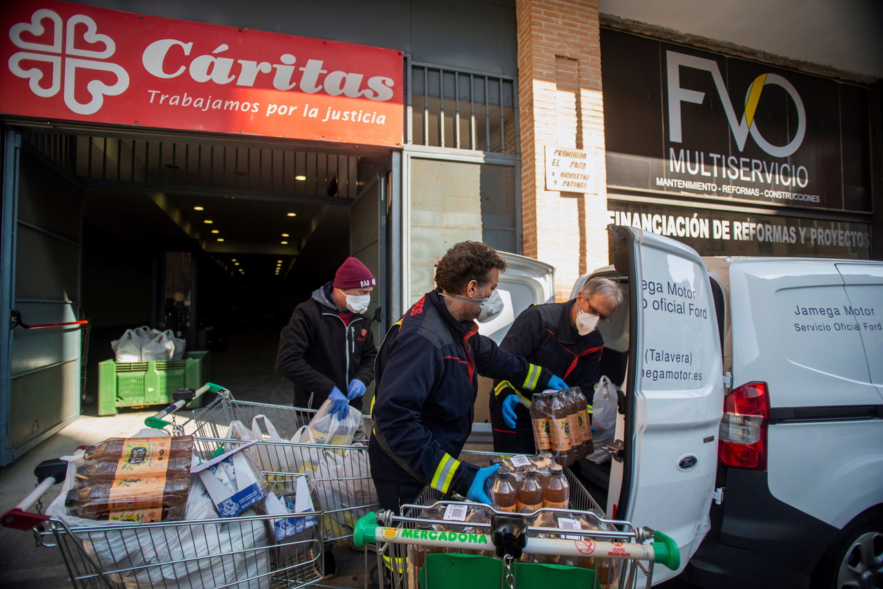 Firemen deliver emergency food bags to the home of elderly and dependent people in Talavera de la Reina, Toledo, Spain, on March 25, 2020.