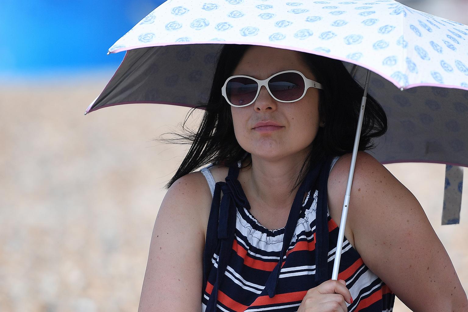 A woman shading herself from the sun in Britain, where temperatures are expected to reach close to 36 deg C.