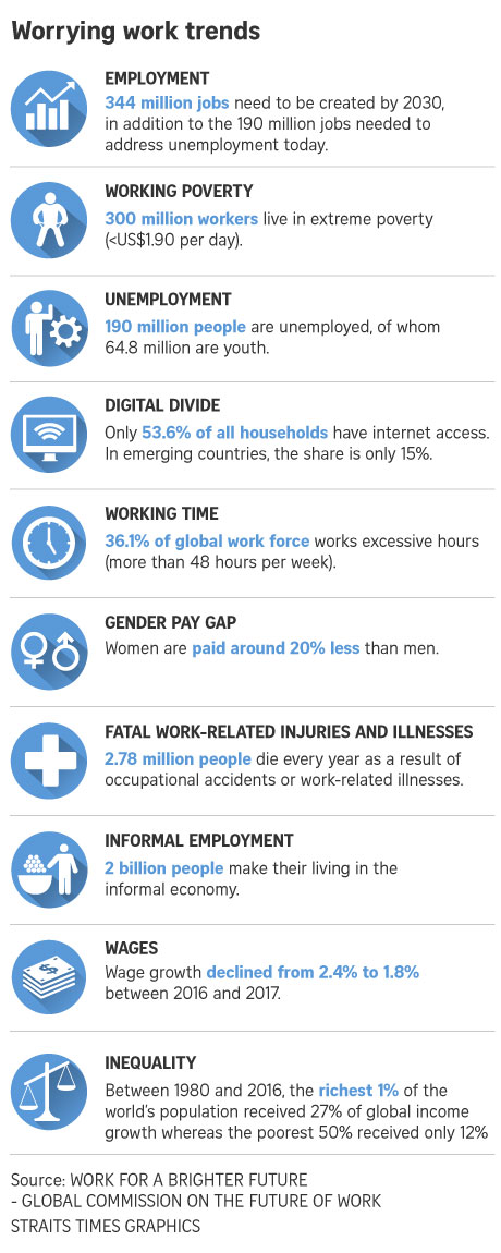 GENEVA - Work in the future should be human-centred, the International Labour Organisation (ILO) urged on Tuesday (Jan 22), as it launched an ambitious agenda to refocus discussion about work that is now being rapidly transformed by technological and economic change.