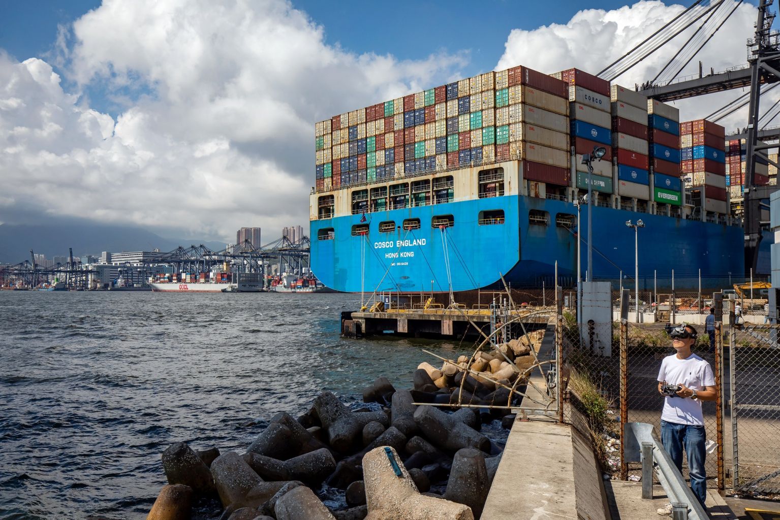 A person flies a drone in front of a ship at the Kwai Chung Container Terminal in Hong Kong, China.