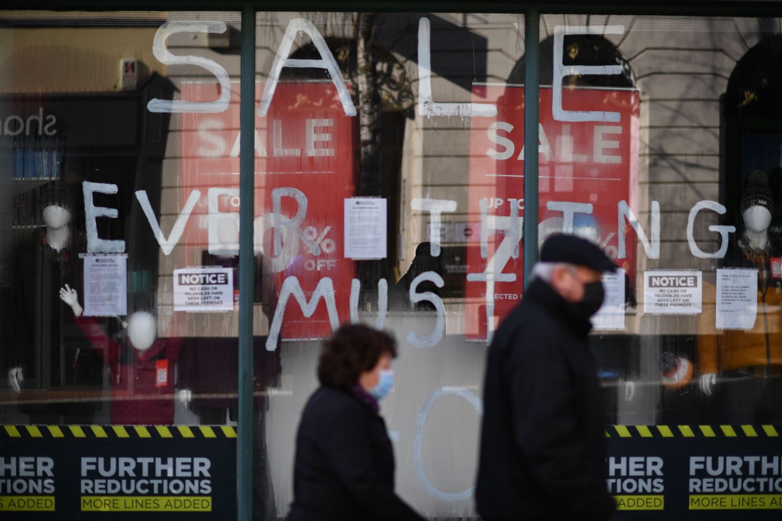 Pedestrians walk past a closed store with a sale sign on the window in Maidstone, south-east England.