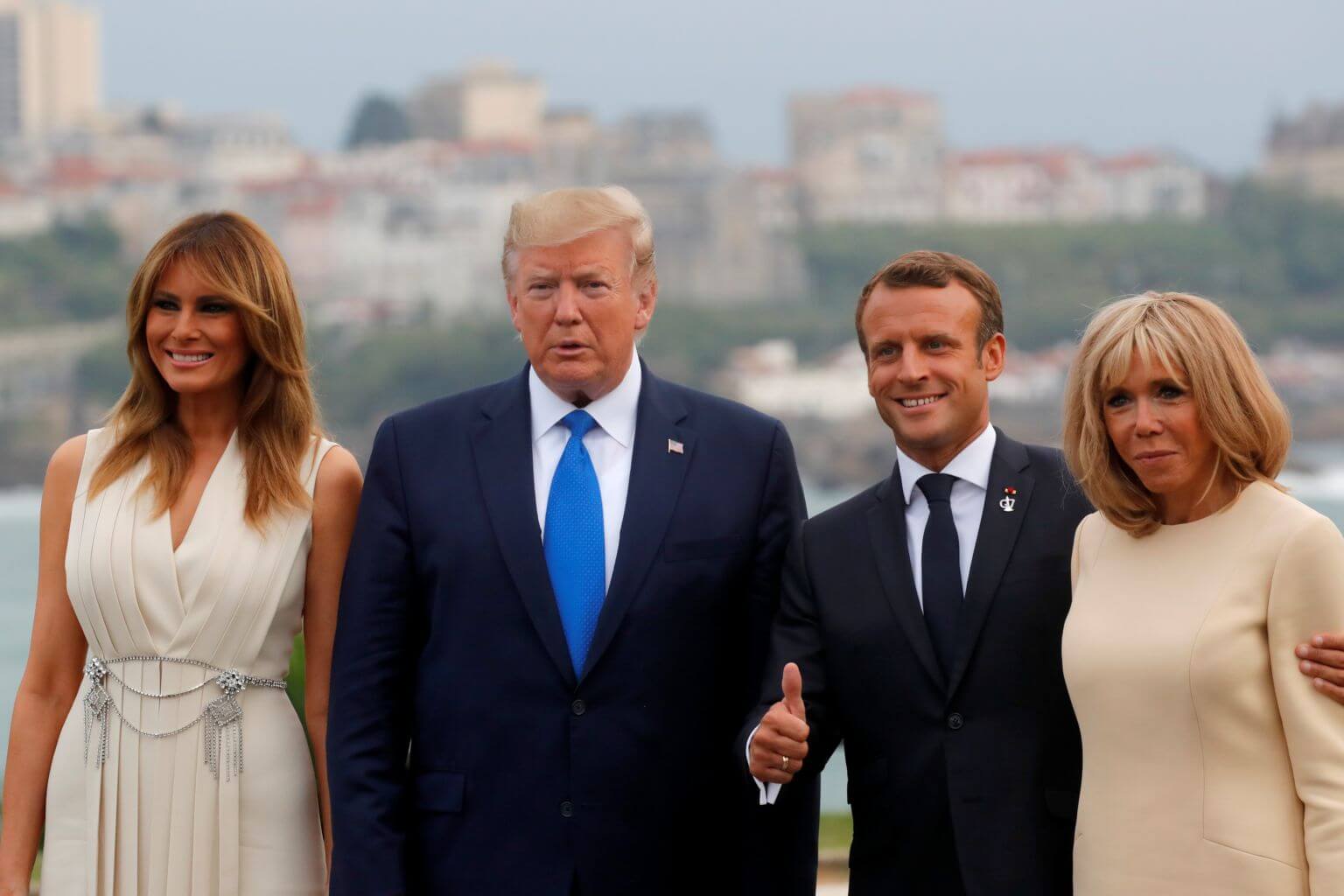 In a photo taken on Aug 24, 2019, French President Emmanuel Macron and his wife Brigitte Macron welcome US President Donald Trump and First Lady Melania Trump as they arrive for a banquet during the G-7 summit in Biarritz, France.