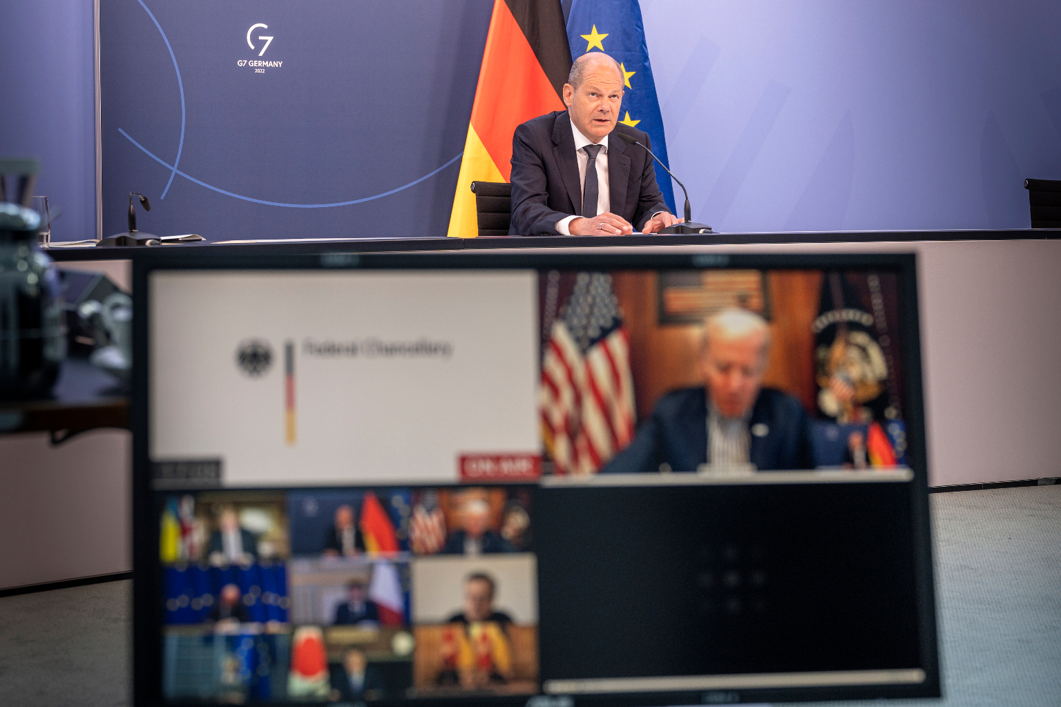 German Chancellor Olaf Scholz (top) during a video call with fellow G-7 leaders, in Berlin, on May 8, 2022.