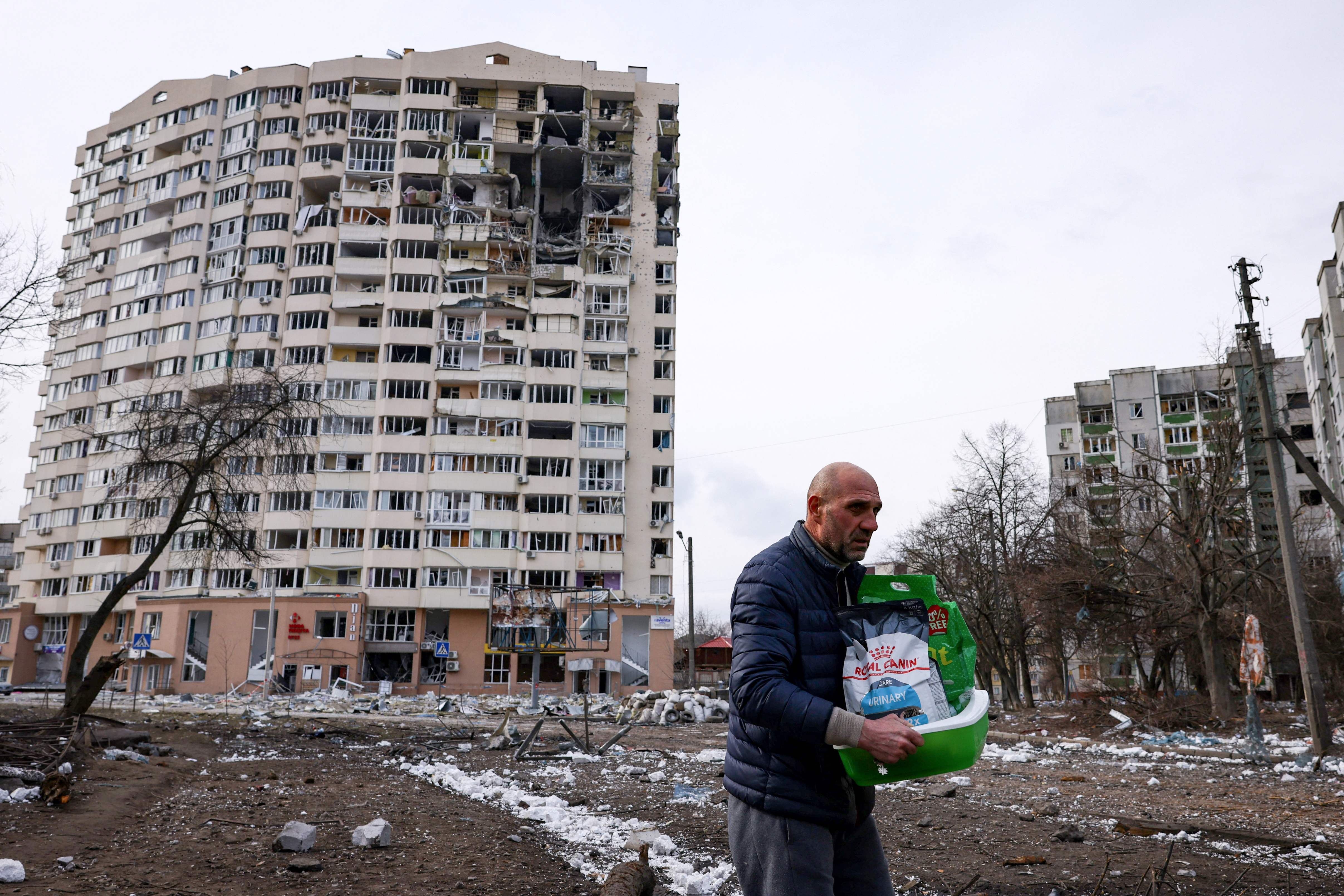 A man walks in front of a residential building damaged by shelling the previous day, in the city of Chernihiv, on March 4, 2022.