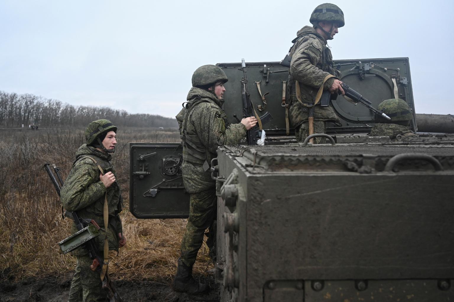 Russian service members board a vehicle during tactical combat exercises at the Kadamovsky range in the Rostov region, Russia on Dec 10, 2021.
