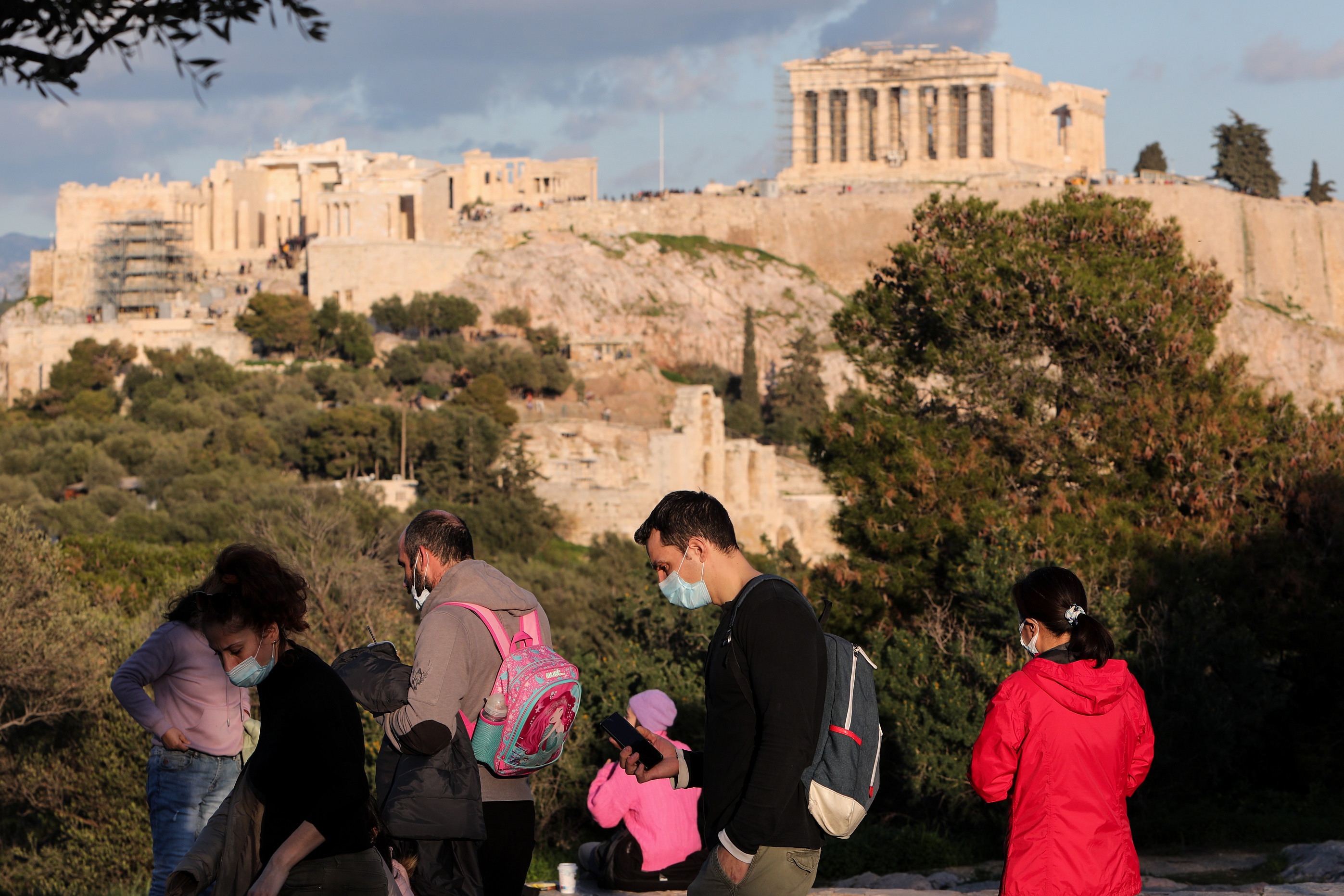 People enjoy an afternoon stroll at the Acropolis area in Athens, Greece, on Jan 2, 2022.