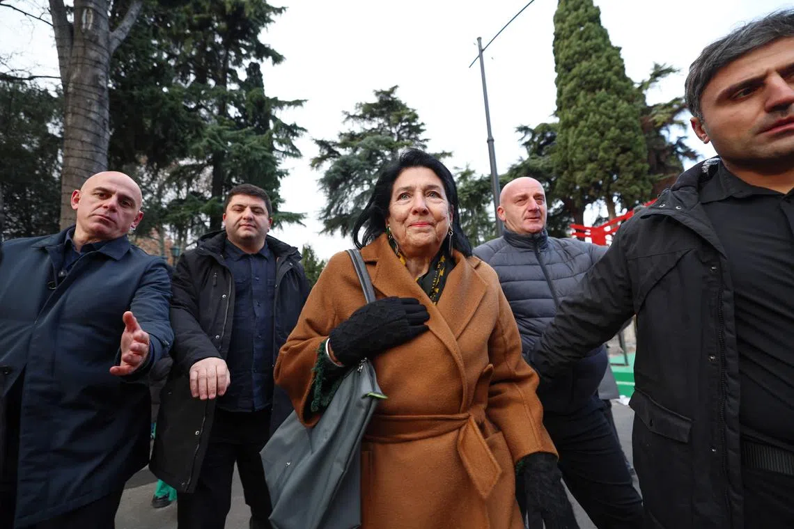 President Salome Zourabichvili outside the Parliament building in Tbilisi as lawmakers elected her successor, on Dec 14. She has vowed to remain as president after her term ends.
