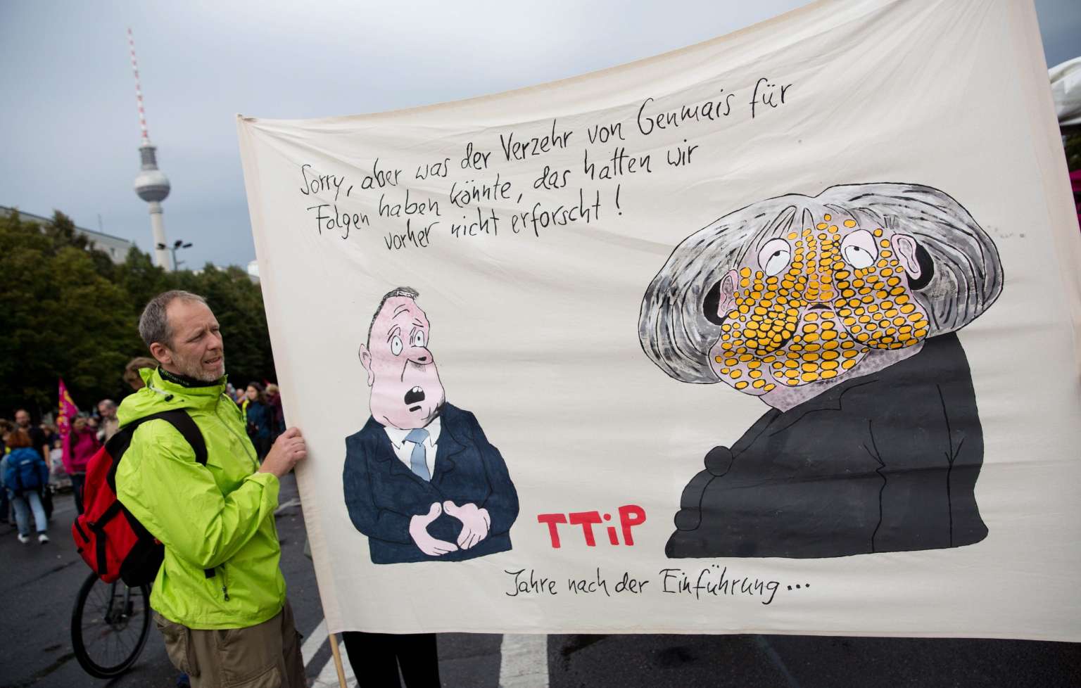 An activist carries a banner with a caricature of German Chancellor Angela Merkel (R) and slogan reading: 'Sorry, we have not previously explored what consequences the consupmtion of GM maize could have! TTIP Years after its introduction ...