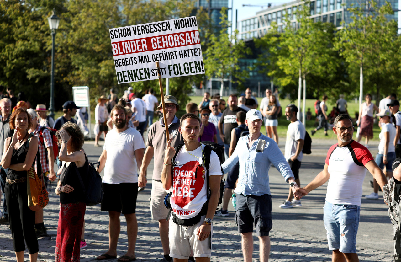 In a photo from Aug 1, 2020, protesters take part in a demonstration against the government's Covid-19 restrictions in Berlin.