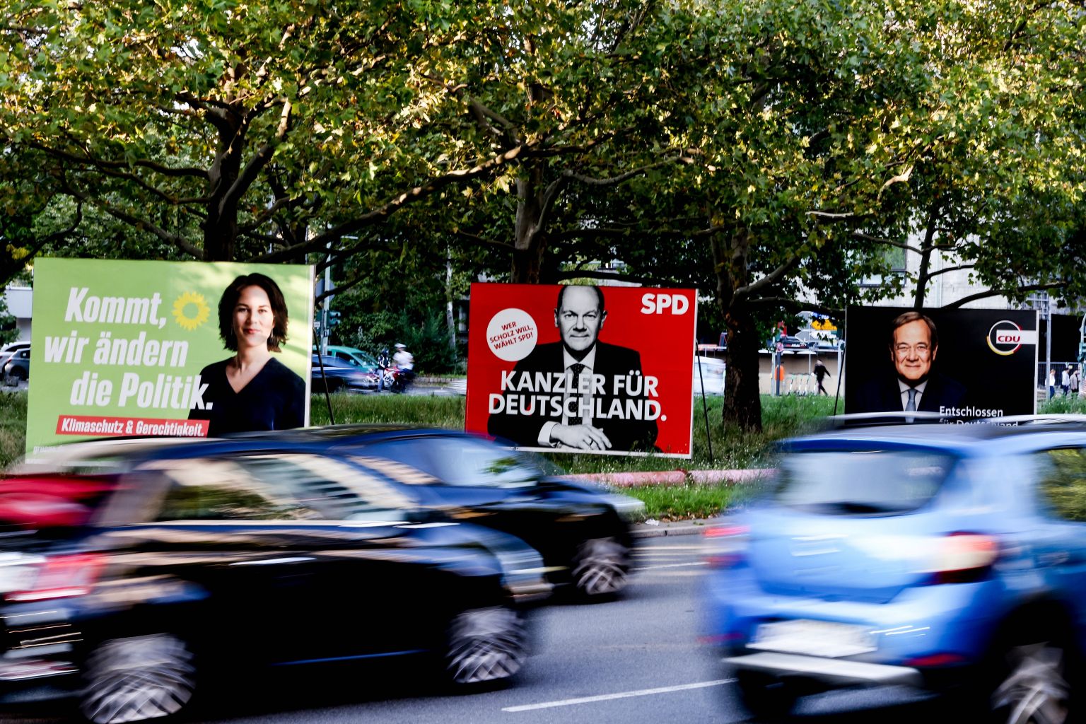 Election campaign posters in Berlin show the top candidates for German Chancellor (from left) Annalena Baerbock (Alliance 90/The Greens), Olaf Scholz (Social Democratic Party), and Armin Laschet (Christian Democratic Union).