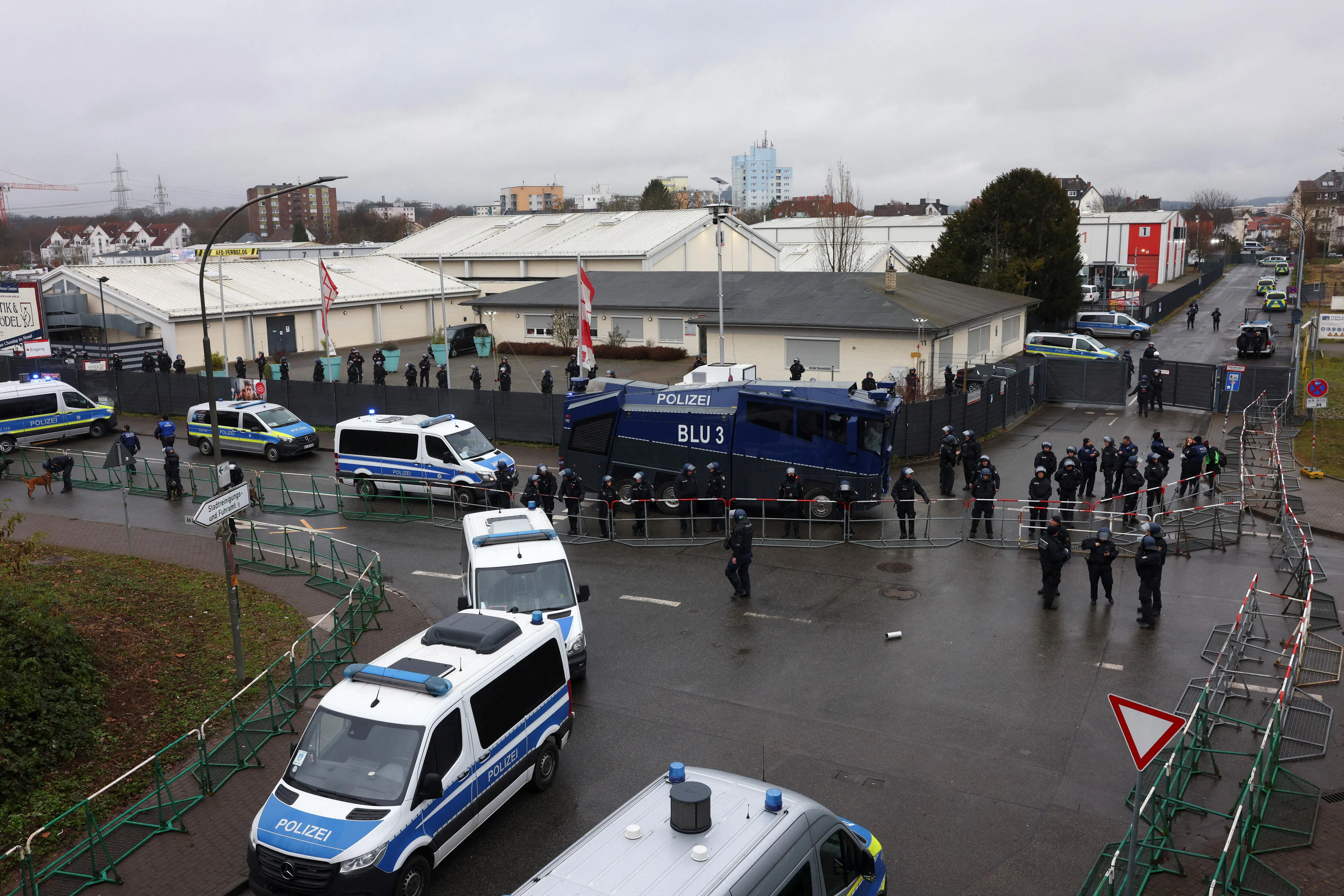 Police standing guard at the venue for the AfD’s launch in Giessen, Germany, on Nov 29.