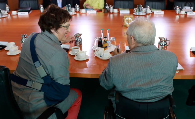 German Economy and Energy Minister Brigitte Zypries (left) talks with German Finance Minister Wolfgang Schaeuble prior to the weekly cabinet meeting on July 12, 2017 at the Chancellery in Berlin.