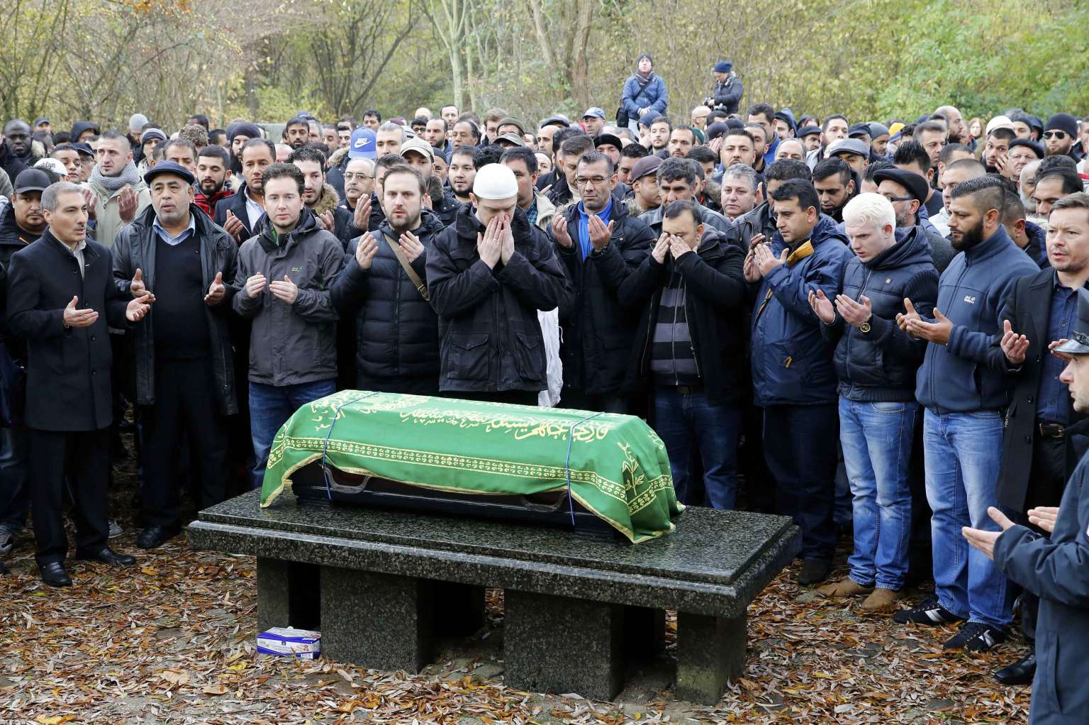 People pray at the funeral of Mohamed Januzi at a Muslim cemetery in Gatow outside Berlin, on Nov 5, 2015.