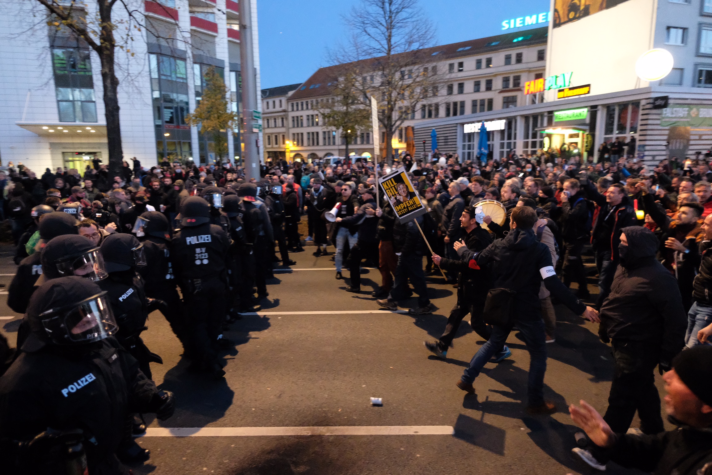 Saturday's protest in the eastern German city saw an estimated crowd of around 20,000 and German media reported that some of those who clashed with police were members of far-right groups.