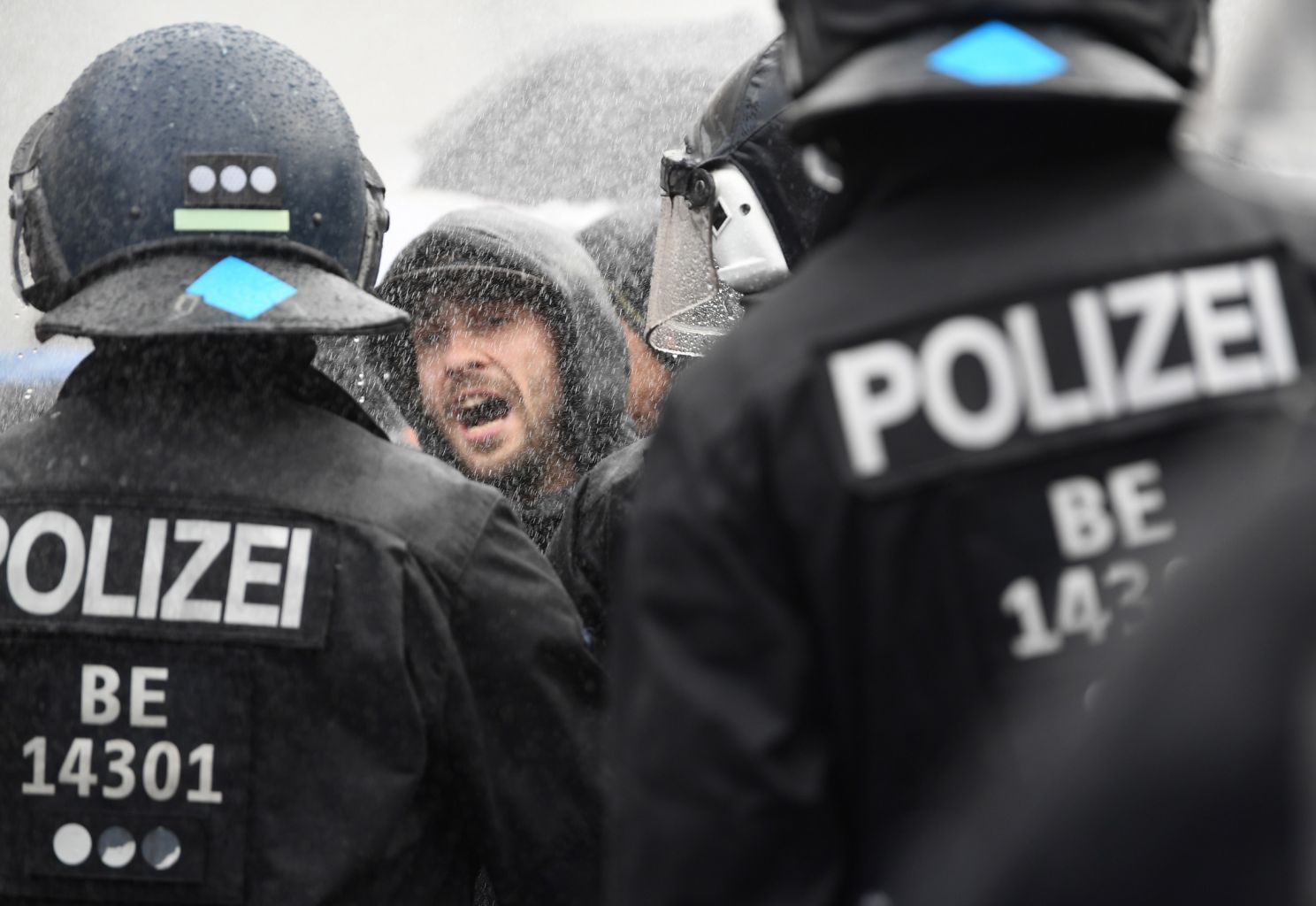 A protester shouts at riot police in the spray of water cannons.