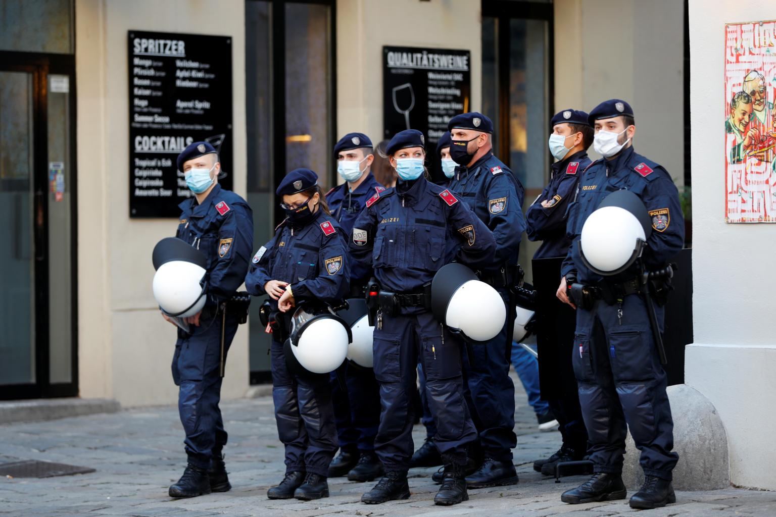 Police officers patrol near the site of a gun attack in Vienna, Austria, on Nov 5, 2020.