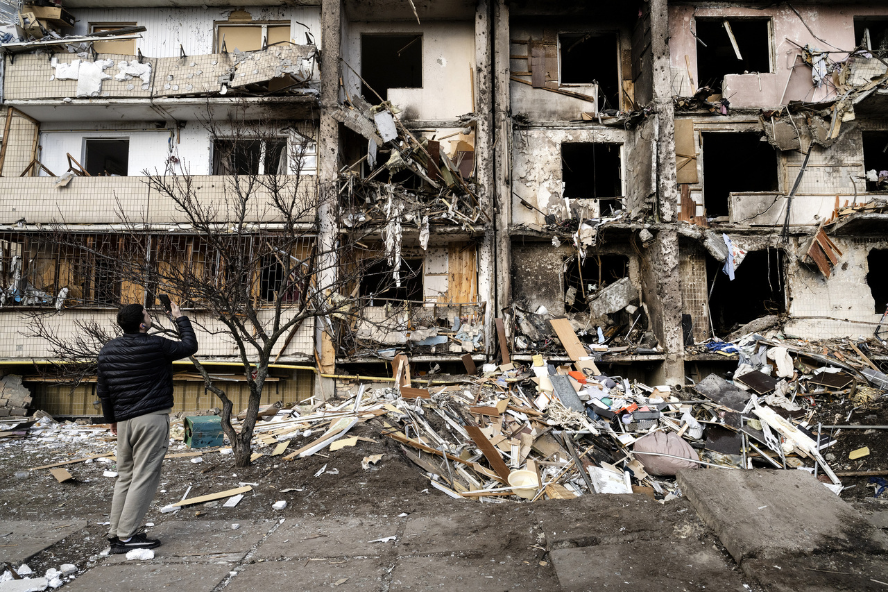 Ukrainians survey debris after a residential building was hit by missiles in the country's capital of Kyiv, on Feb 25, 2022.