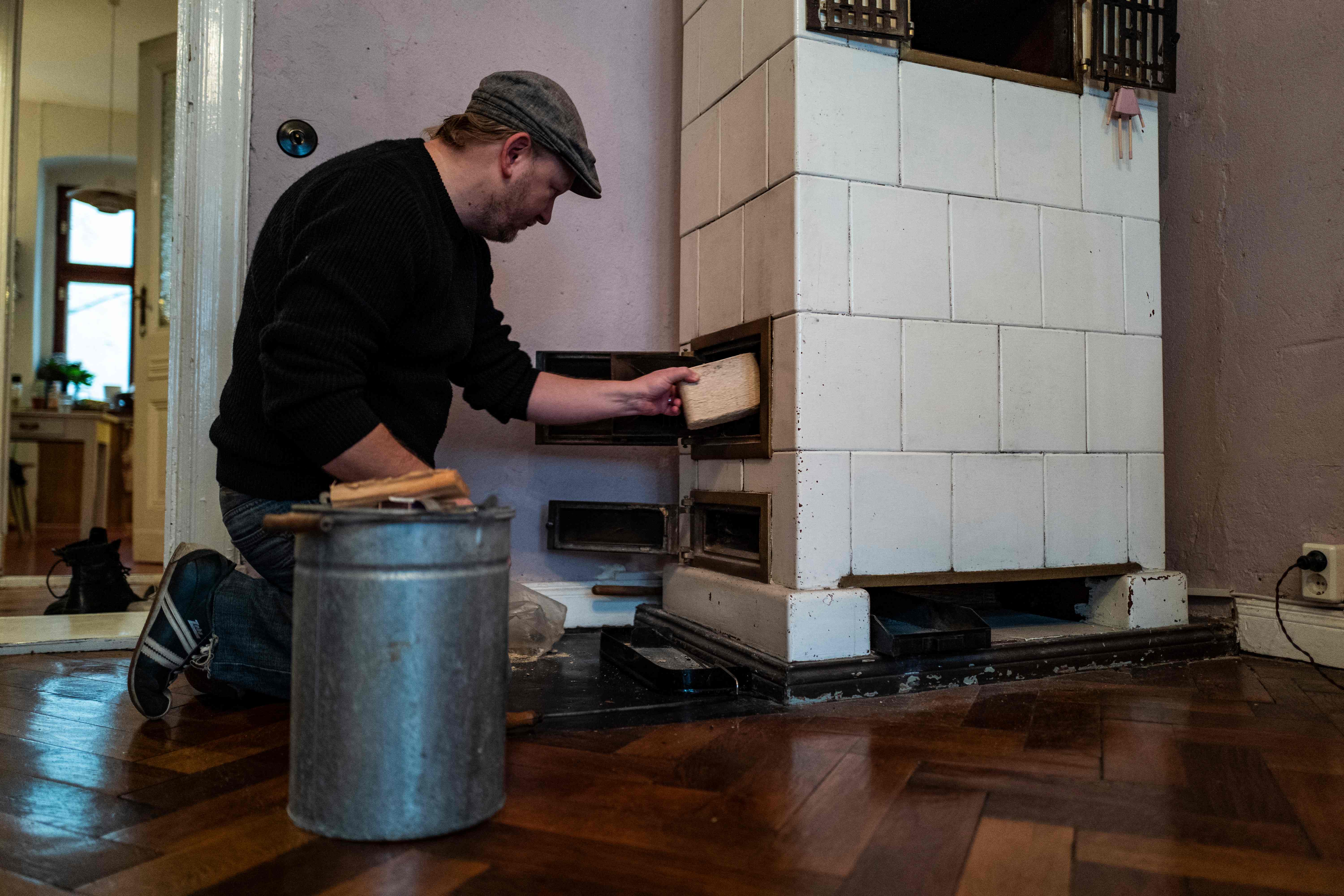 A Berlin resident loads a ceramic-tiled heating oven with wood at his flat in the German capital.